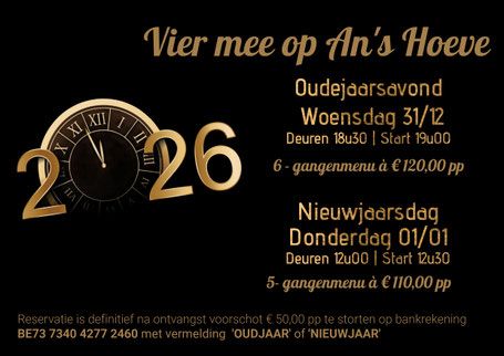 Op woensdag 31 december en donderdag 1 januari vieren we, graag met u, Oud en Nieuw. Ons menu voor beide dagen staat online en inschrijven is reeds mogelijk. U vindt het menu op onderstaan 'button'.
