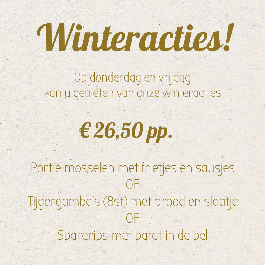 Elke donderdag en vrijdag kan u bij ons genieten van een zilte portie mosselen (bereiding naar keuze), sappige spareribs met een aardappel in de pel of heerlijke tijgergamba's (8 st) met een fris slaatje en brood.