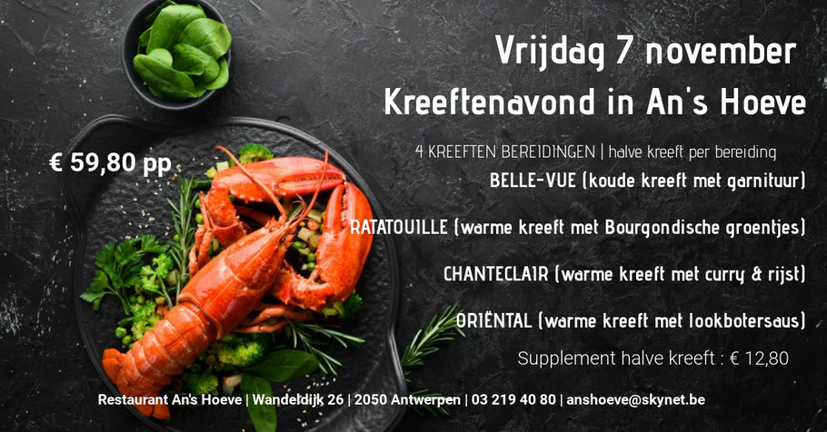 Kreeftenavond: Elke 1ste vrijdag van de maand organiseren wij een kreeftenavond. Op deze avond kan u genieten van 4 verschillende bereidingen (halve kreeft per bereiding). Vanaf maart voorzien wij Live muziek zodat u, indien gewenst, de beentjes kan loszwieren. Deze activiteit is zeer populair dus reserveren is zeker aangewezen.