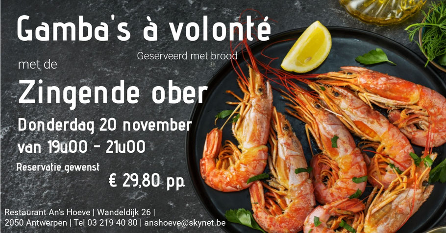 Gamba's à volonté: Elke 3e donderdag van de maand organiseren wij een avond waar u à volonté kan genieten van onze heerlijke gamba's. Tot en met november komt de Zingende Ober maandelijks naar An's Hoeve. Indien u wenst kan u de beentjes loszwieren of meezingen met bekende en minder bekende nummers. Deze activiteit is zeer populair dus reserveren is zeker aangewezen!