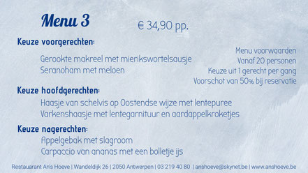 Je kan een keuze maken uit onderstaande menu's. Gelieve je keuze te beperken tot 2 verschillende gerechten per gang.