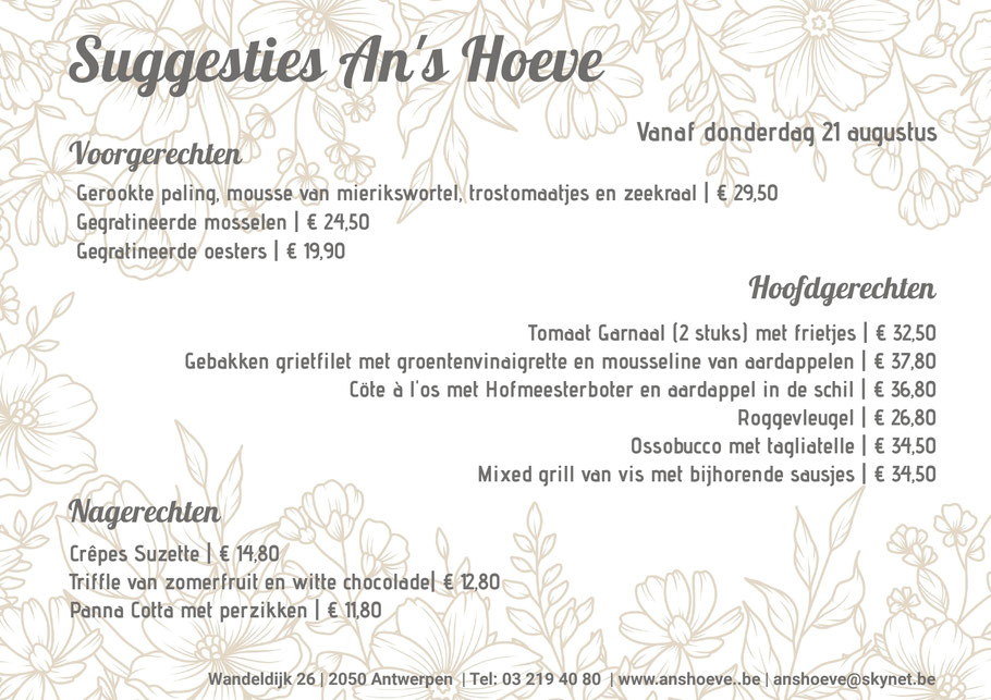 Chef Tonny heeft weer zijn best gedaan om jullie te vergasten op heerlijke suggesties. Deze suggesties zijn verkrijgbaar vanaf vrijdag 25 juli.